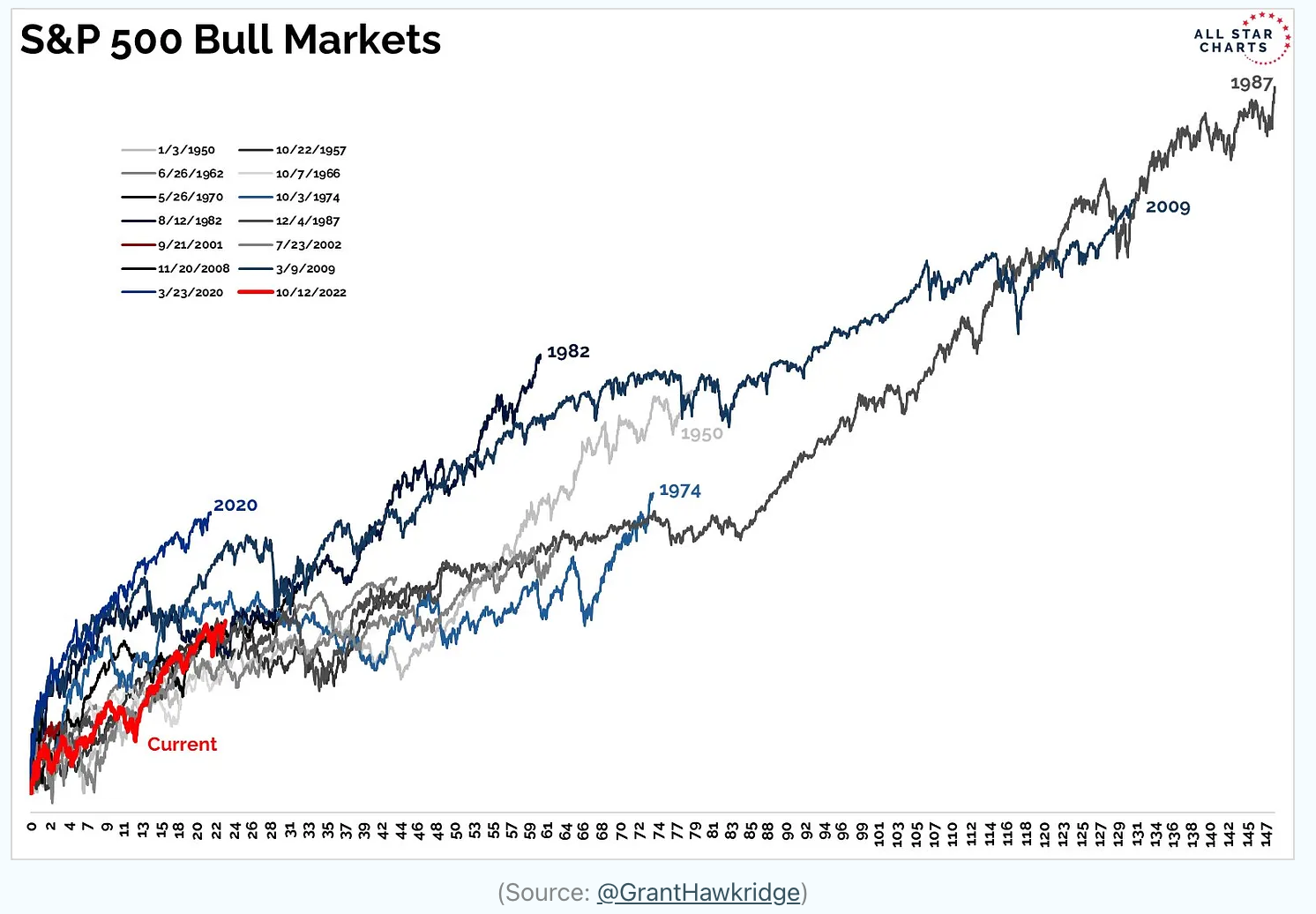 THIS BULL MARKET IS STILL QUITE YOUNG: For all the pundits who have expressed skepticism toward the market's performance over the last couple of years, it's worth noting that this bull market is still comparatively young and has also been relatively tame thus far. Grant Hawkridge of All Star Charts put together the visual below to compare the current market (in red) to all previous bull markets since 1950 and I think the visual adds incredible perspective as to how this market compares. As far as I'm concerned, so far, so good, and hopefully, we have a long way to go. (Source: All Star Charts via TKer)