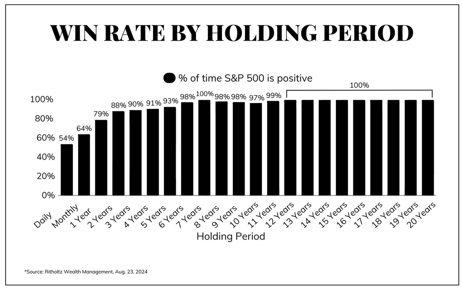 THE VALUE OF EXTENDING YOUR TIME HORIZON: While the media spends most of their time discussing "volatility risk," there's a simple antidote available to all of us. That is, to extend your time horizon. Historically speaking, the longer you own your portfolio, the less likely it is that you'll experience a negative return. That might be stating the obvious, but you may be surprised to learn that over periods of just three years or longer, the historical probability of a positive return is 90% or higher. Not too bad! (Source: The Bahnsen Group)