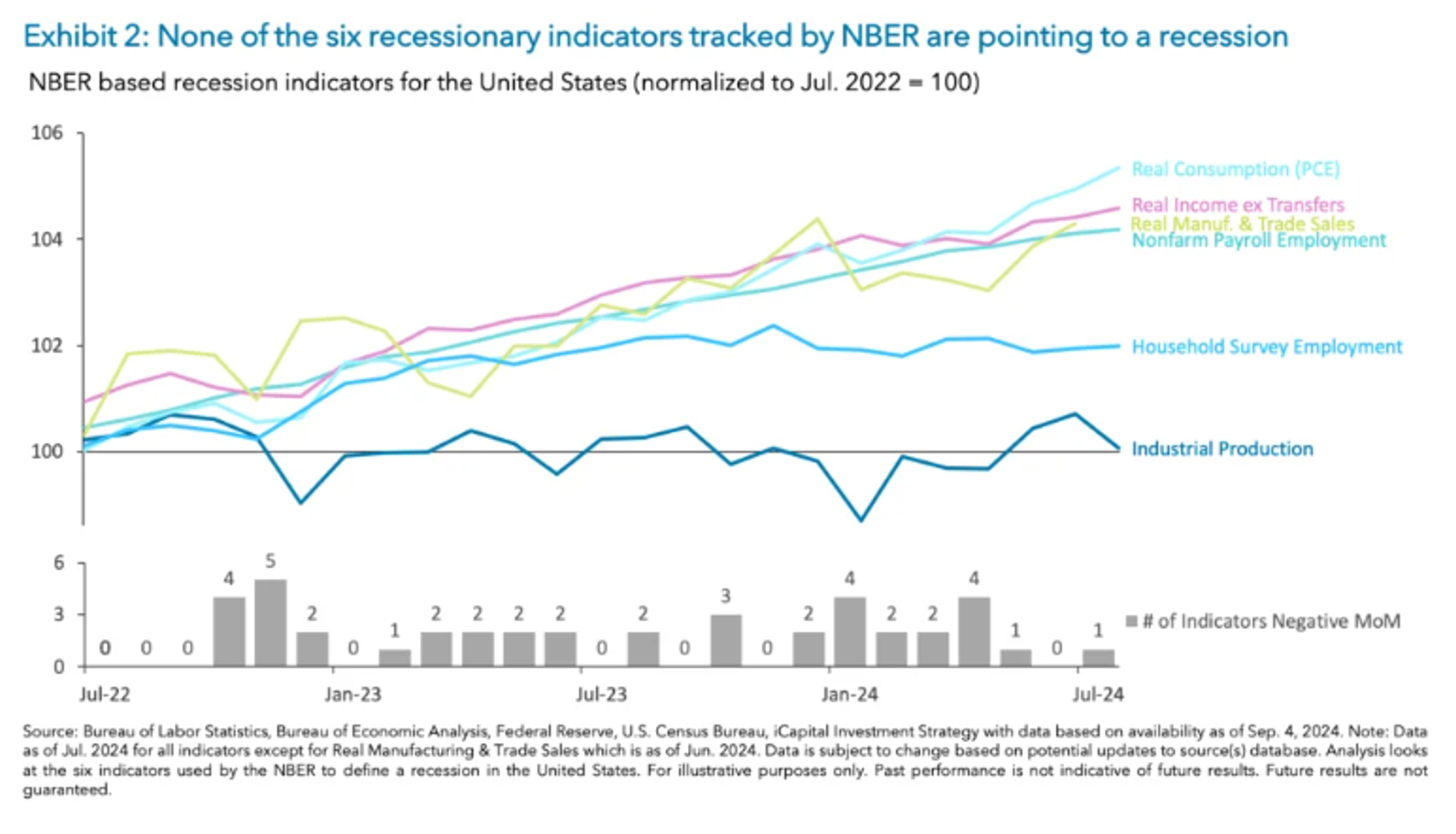 THE LOOMING RECESSION: The constant drumbeat of the 2020s has been an expectation that the economy is doomed for a recession. Not to spoil everybody's fun, but this is inevitably true as the great Howard Marks has pointed out, "Whenever we're not in a recession, we're heading toward one." This is simply a fact of life and has been true throughout our investing lives. But when you consider our historical investing experience, it's clear that recessions are not the end of the world for investors who have patience—I have more to say about patience in a moment. In any case, in light of the constant recession rhetoric, it's interesting to see that the data continues to be mostly positive, with none of the six recessionary indicators pointing to a recession as we speak. (Sources: Chart: iCapital, Quote: Oaktree)