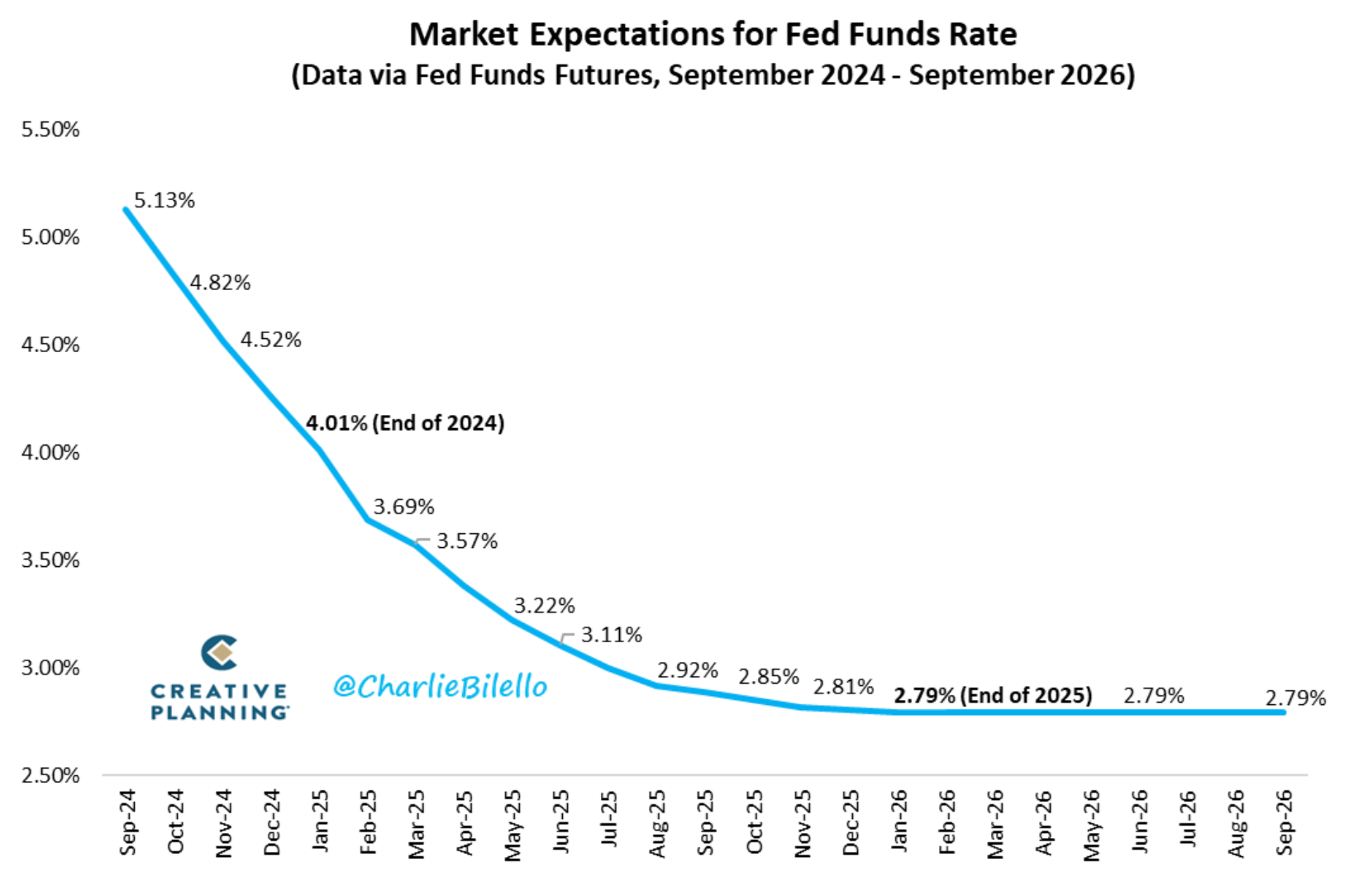 WHAT'S NEXT FOR THE FED?!: Beyond the market, the next most popular request has been for my opinion on the future of interest rates. While you know that we steer clear of forecasting, I thought I'd share the current consensus forecast. If the Fed Funds Futures are accurate (mind you, that's a big IF), then rates could drop down to about 4% by the end of the year and then to 2.80% by the end of 2025. The latter appears to be where rates may ultimately settle. Again, I stress that these are forecasts which may or may not represent reality, so it will be interesting to see how things play out. (Source: Charlie Bilello)
