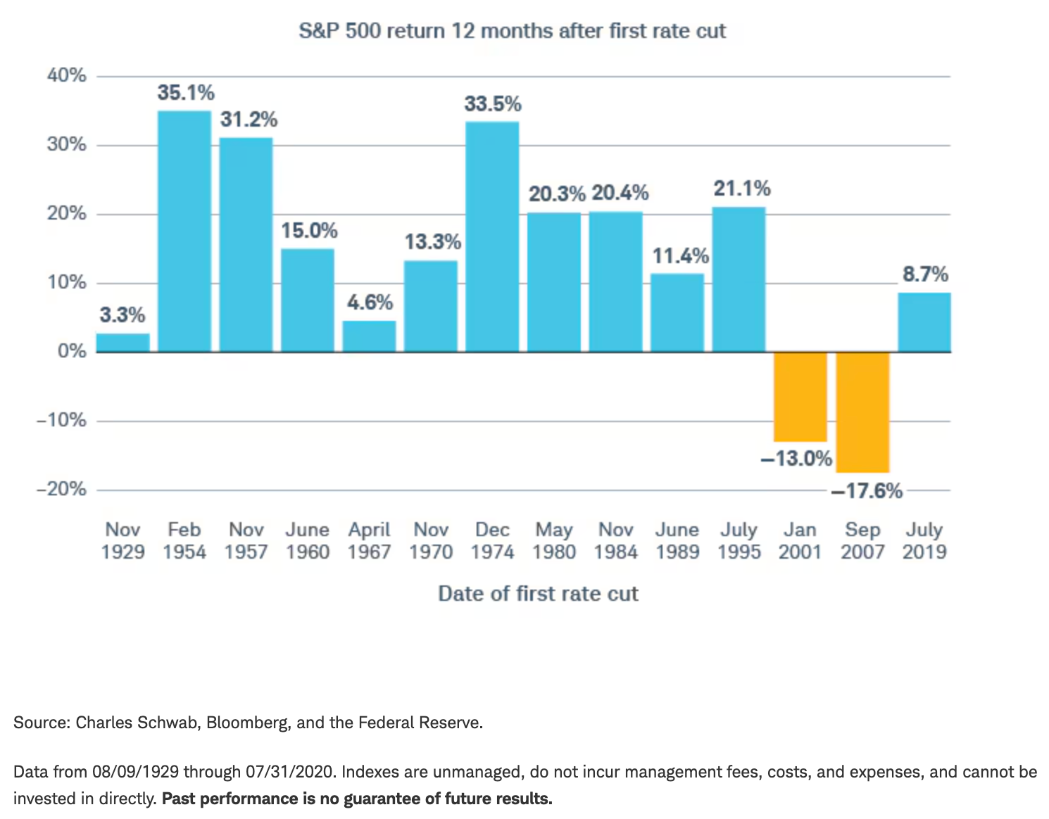 RATE CUTS AND MARKET PERFORMANCE: The biggest news this month (or this year) was the Fed's decision to cut rates by 0.50%. While the market has mostly gone up since the announcement, you might be curious to know how the market has performed during previous rate-cutting cycles. Since 1929, there have been 14 rate-cutting cycles, and 12 of them resulted in a positive return in the 12 months that followed the first rate cut. The two exceptions, however, were both in this century, with the Tech Crash and the Great Financial Crisis resulting in negative returns. Make of that what you will, but I think it's fair to say that today's market environment is not reflective of either of those two instances. (Source: Charles Schwab)
