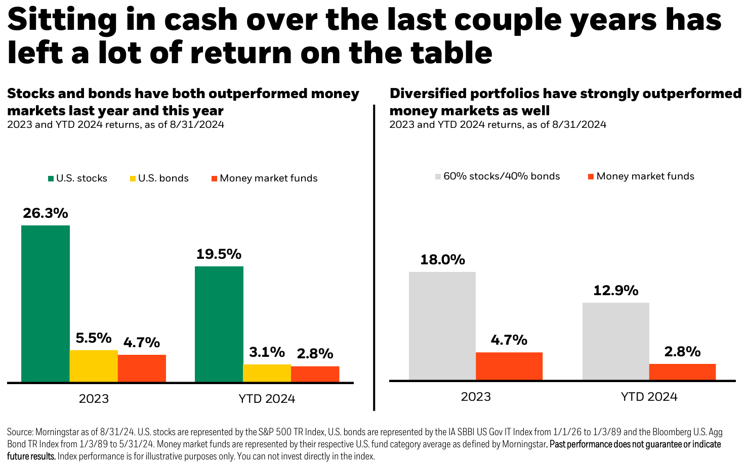 HIDING OUT IN CASH COMES WITH A COST: Given interest rates, many investors rushed to "invest" cash in money market funds over the past couple of years. But at what cost? It's not surprising that cash accounts have underperformed equities, though it is striking by how much! But given the paltry performance of bonds, it's noteworthy that they also outperformed money market accounts. With rates now falling, one can only imagine what this chart will look like over the coming few years. (Sources: Chart: Blackrock, Money Market Funds: St. Louis Fed)