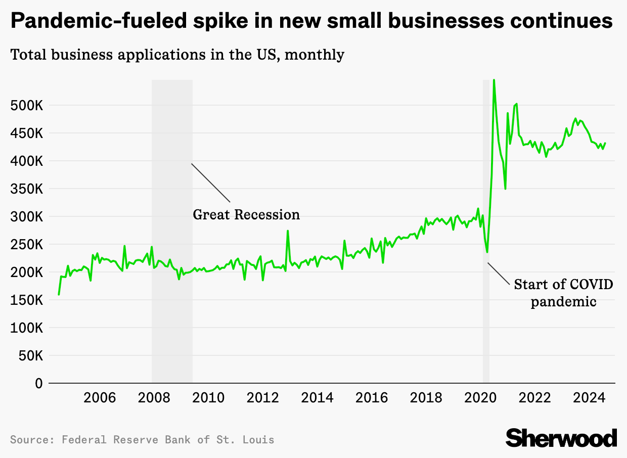 "NEW BUSINESS STARTS" REMAIN VERY HIGH: Say what you want about how pessimistic people generally are these days, but I think we can all probably agree that it requires significant optimism to start a business. Remarkably, as you can see below, the small business boom continues to be strong—sustainably about 40%-50% higher than pre-pandemic levels, which is incredible! Given this trend, I'm guessing there is much more optimism out there than the media cares to share. (Source: Sherwood)