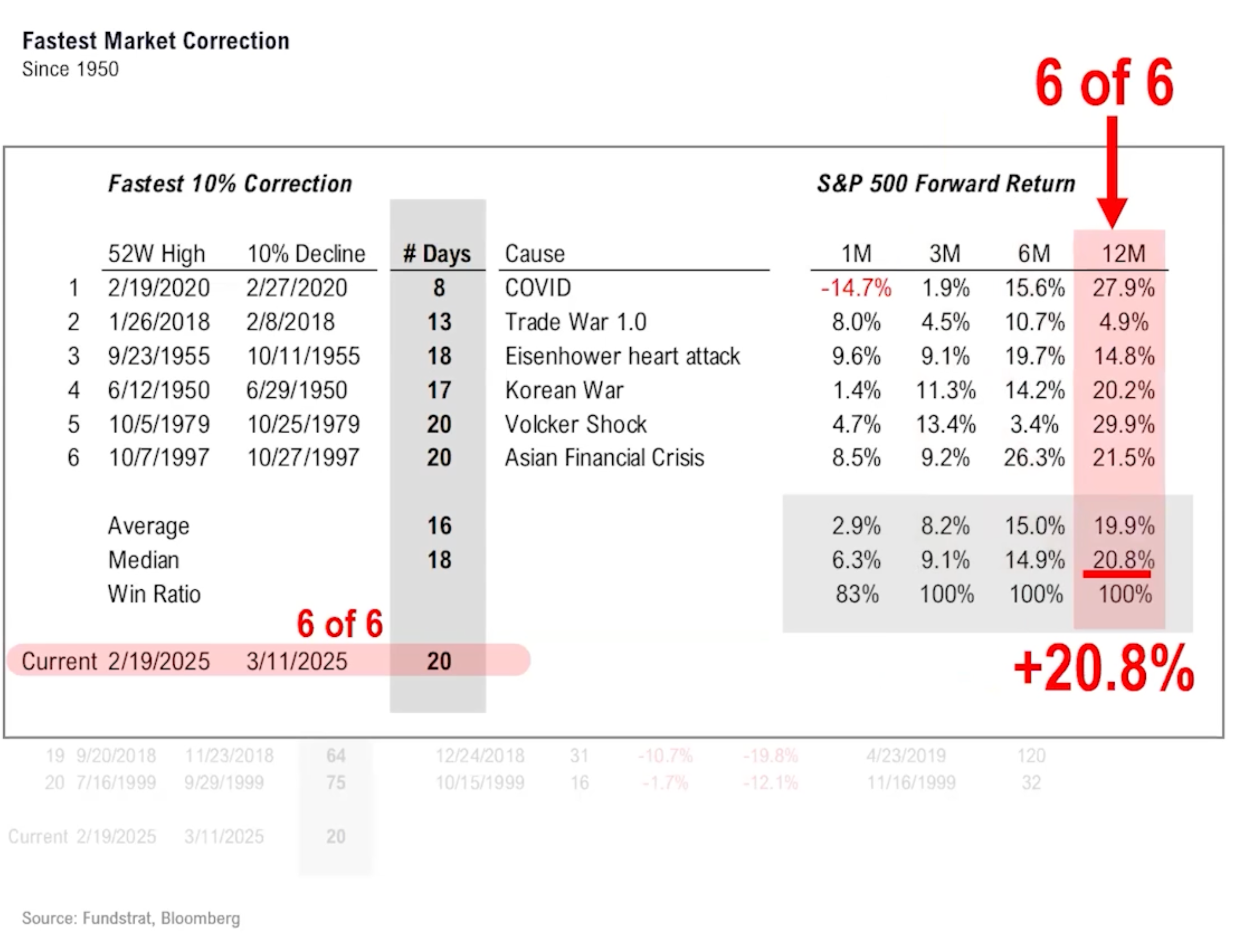 Here’s the silver lining: Historically, when stocks have dropped 10% this quickly, they tend to bounce back strongly. In similar past cases, the market was up an average of 6% one month later, 15% six months later, and 21% a year later. Of course, nothing is guaranteed, but history shows that sharp corrections often create opportunity—not just risk.