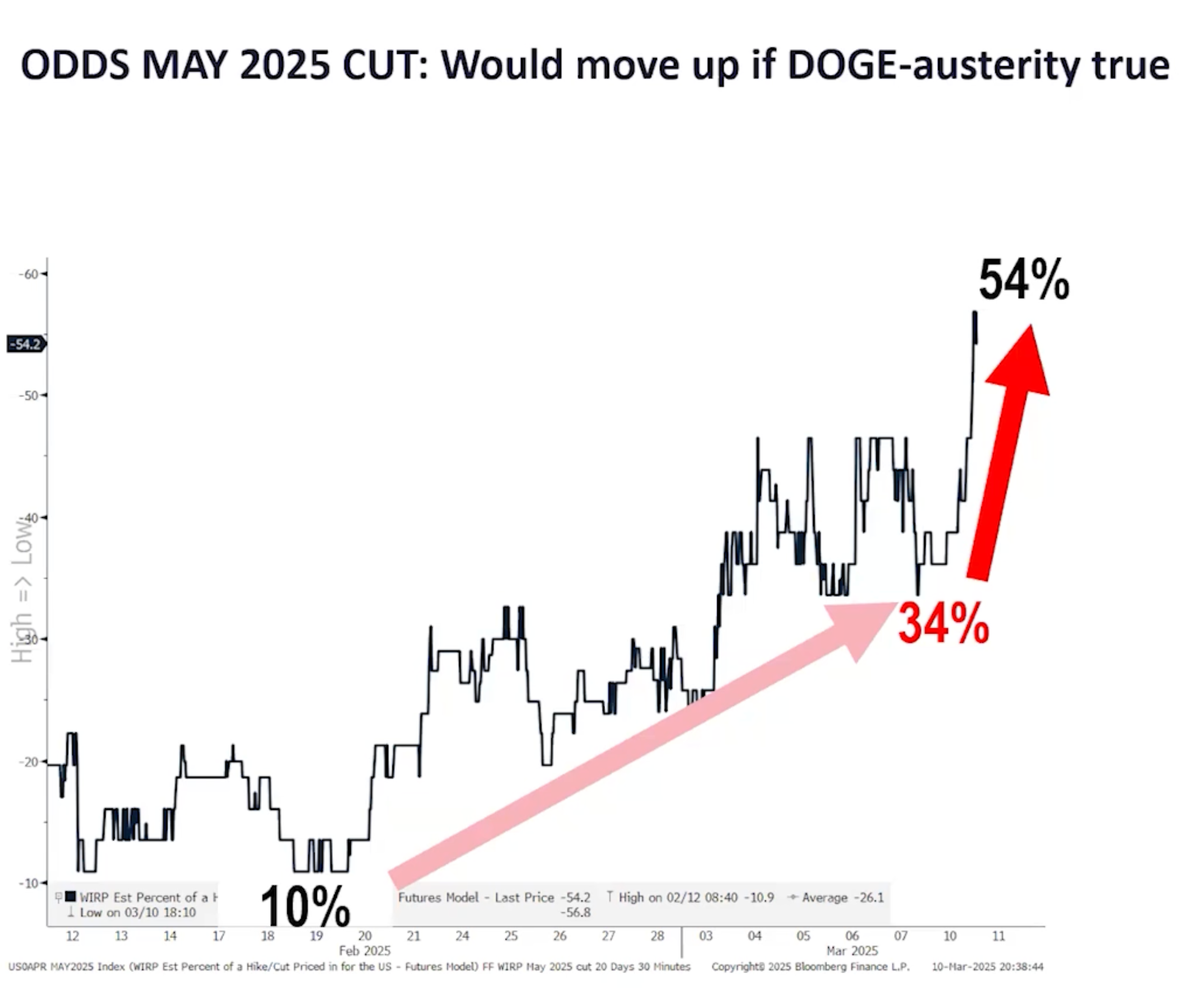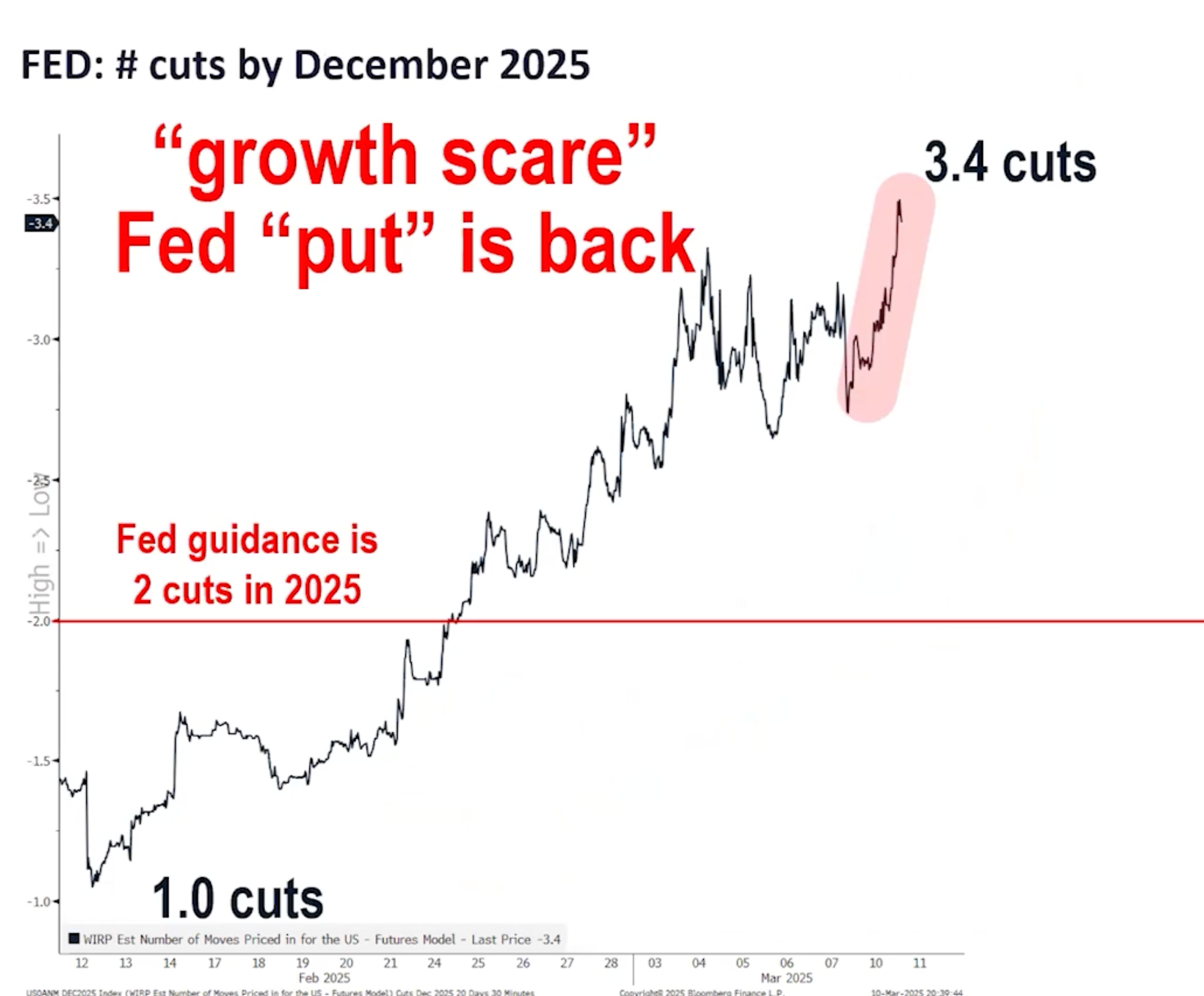 At the same time, the bond market is showing more resilience, particularly in high-yield credit. Why? Investors believe a “Fed put”—a willingness by the Federal Reserve to ease policy if conditions deteriorate—is still in play. Rate cut odds for May have jumped to 54%, and the bond market is now pricing in 3.4 rate cuts in 2025, more than the Fed’s official guidance.